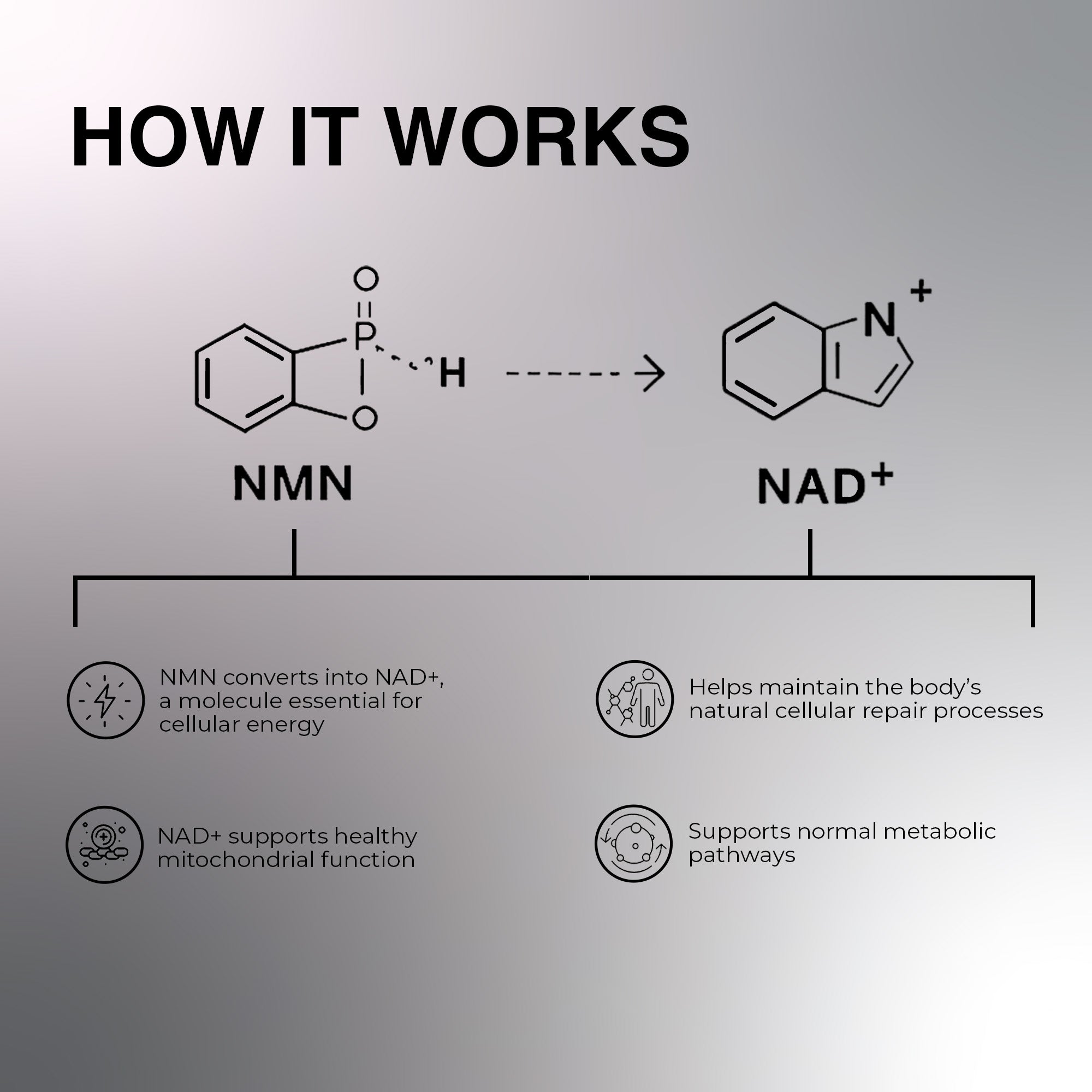 NMN (Nicotinamide Mononucleotide) is a scientifically formulated cellular wellness supplement designed to support natural NAD⁺ levels, cellular energy production, and healthy aging pathways. Built for individuals focused on long-term metabolic, cognitive, and skin wellness, this clean daily formula supports cellular repair and oxidative balance. Manufactured under strict quality standards, NMN fits easily into proactive longevity-focused wellness routines.