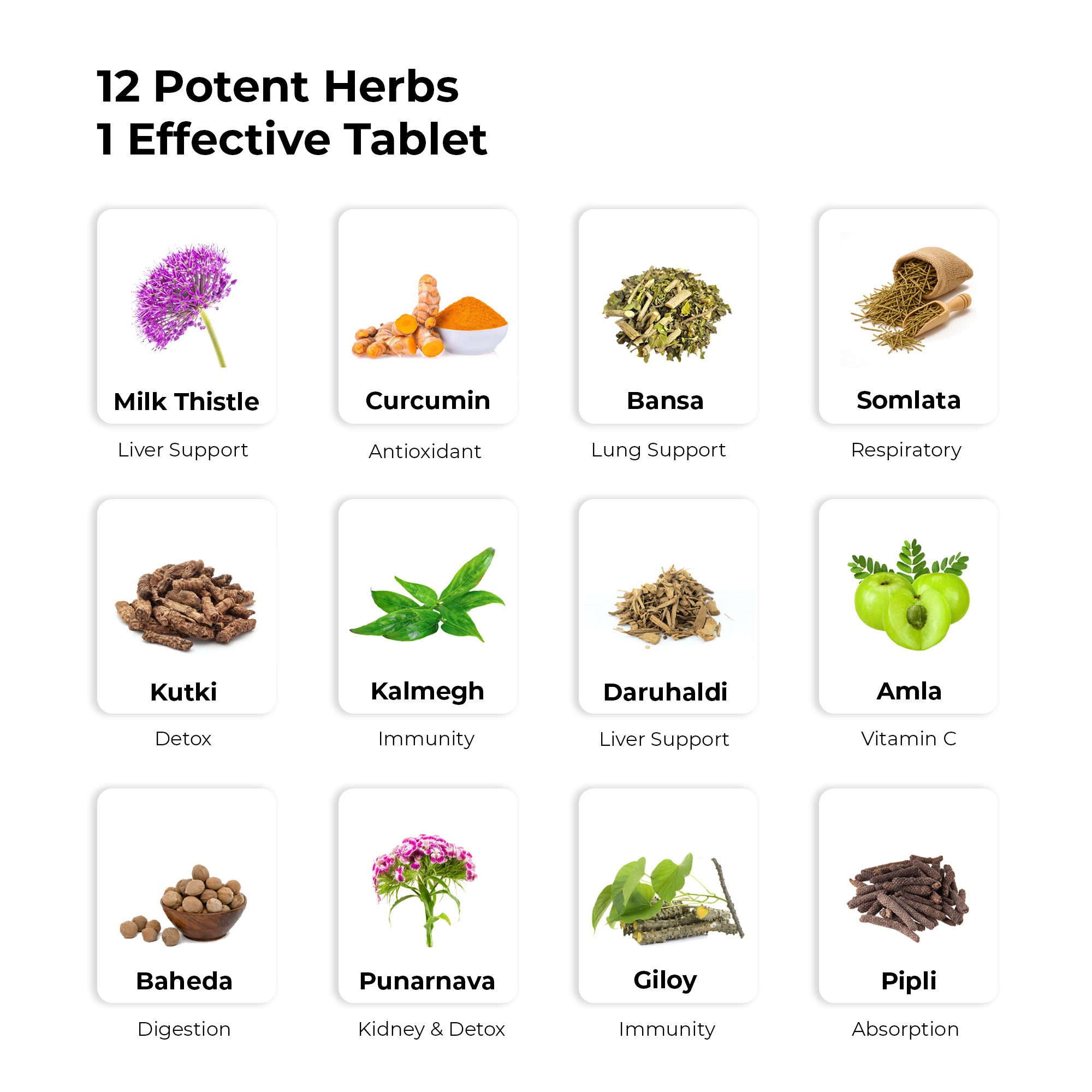 2. Ingredient list: Curcumin (Curcuma longa) – 100 mg, Bansa (Adhatoda vasica Nees) – 100 mg, Somlata (Ephedra gerardiana) – 100 mg, Baheda (Terminalia bellirica) – 50 mg, Amla (Phyllanthus emblica) – 50 mg, Kutki (Picrorhiza kurroa) – 100 mg, Kalmegh (Andrographis paniculata)– 100 mg, Punarnava (Boerhavia diffusa) – 100 mg, Daruhaldi (Berberis aristata) – 100 mg, Giloy (Tinospora cordifolia) – 50 mg, Milk Thistle (Silybum marianum) – 140 mg, Pipli (Piper longum) – 10 mg